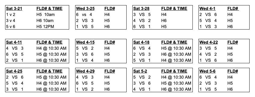 All games start at 6 P.M. on weekdays and time stated on Saturdays.
